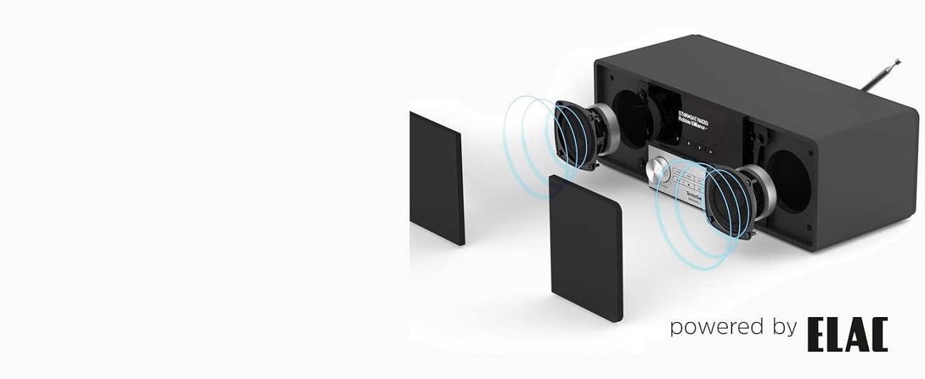 Das Digitalradio verfügt über zwei 10-Watt-Lautsprecher vom Soundspezialisten ELAC, die durch eine optimierte Anordnung für einen perfekten Stereoeindruck sorgen – unabhängig davon, wo Sie sich gerade im Raum befinden.