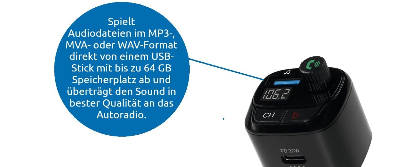 Der kompakte FM-Adapter überträgt Musik und Anrufe drahtlos vom Smartphone an das Autoradio – ganz ohne komplizierte Umbauten. Dank der integrierten Freisprechfunktion schaltet das Gerät automatisch in den Telefonmodus, sobald ein Anruf eingeht.